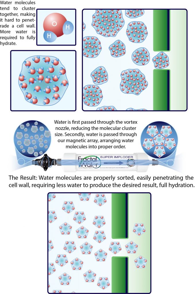 During this process of passing water through a high magnetic flux density field the molecules in the water, begin to sort themselves, or self organize, in the field of the magnets. Its this structuring of the molecules which makes the water more bioavailable to the plants. This is called redox potential, its a measurement of how much water a plant can soak up.