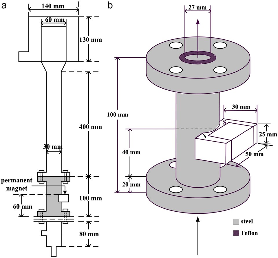 Fig. 2. Specification of the fluidized-bed crystallizer composed of Plexiglas and steel pipes: (a) fluidized-bed crystallizer; (b) permanent magnet fixed on the steel pipe.