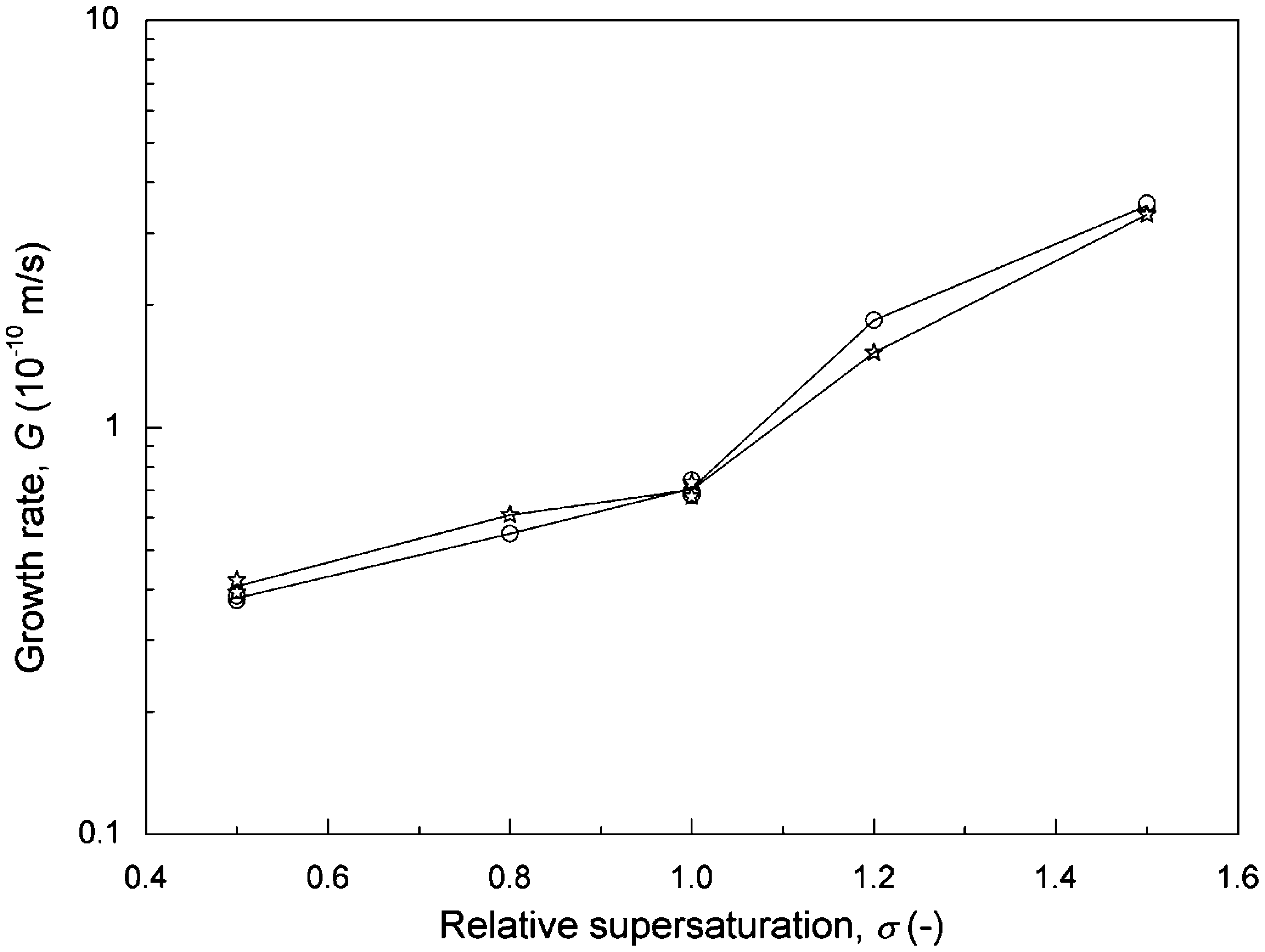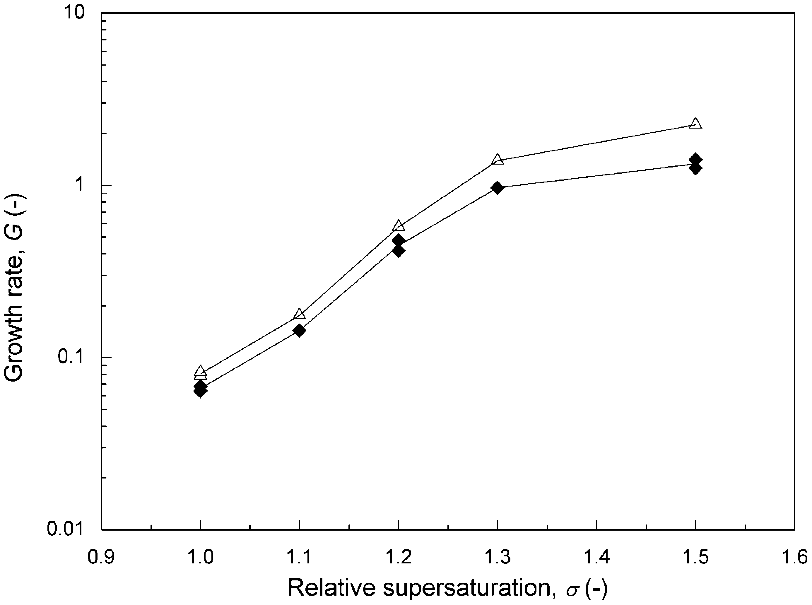 The relative supersaturation, a, defined by Nielsen and Toft (1984) was adopted as the driving force for crystal growth.