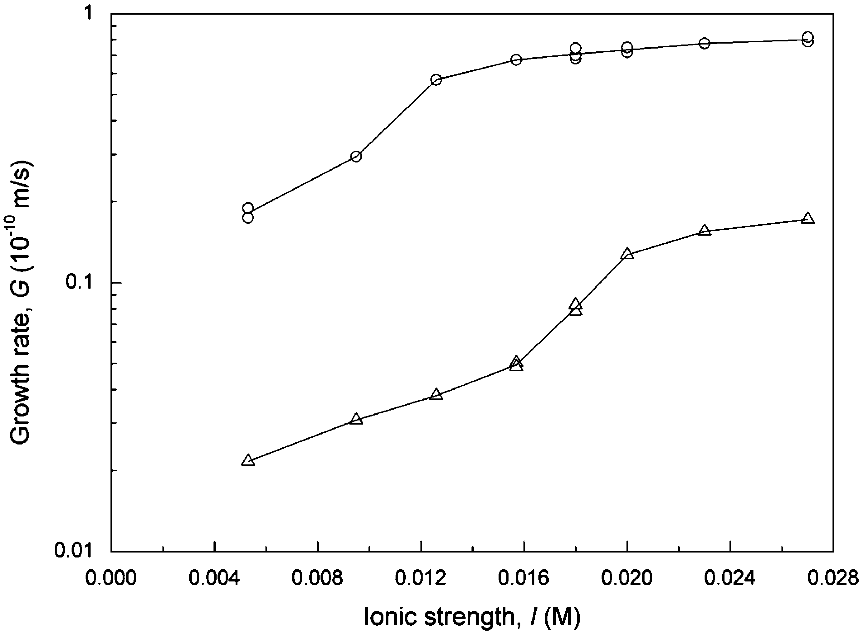 growth rate was reduced by an order of magnitude at pH = 8.5 and did not increase much at higher pHs. As far as the effect of ionic strength was concerned, the growth rates increased with increasing ionic strength then tended to remain constant at higher levels for both cases. A slight difference is that the growth rate curve leveled off at a higher ionic strength for the case with magnetization.
