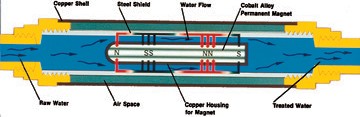 The construction of a magnetic water treatment unit is illustrated in Fig. 7. In-line magnets are installed inside a section of pipe. Water flows through the pipe around the various magnets. The inside diameter of the pipe con- taining the magnets is sized to minimize the pressure drop in the system. the unit shown in Fig. 7 has multiple reversing polarities to create a considerable stronger magnetic flux than can be achieved with a standard 2- pole magnet. A cutaway drawing of a 250-gpm unit is shown in Fig. 8.